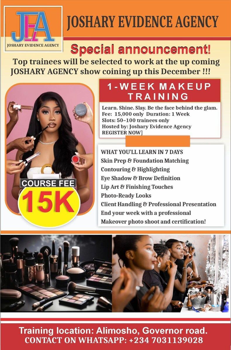 During this engaging workshop, you'll master glam looks, handle clients confidently, and qualify for major beauty events in Lagos this December. Whether you're a beginner or looking to upgrade your skills, this training is your gateway to becoming a certified makeup artist. ππ°