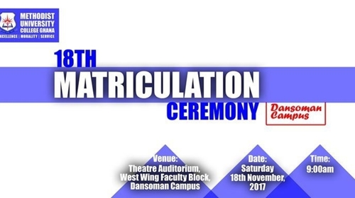 The entire University community is hereby informed that the 18th Matriculation ceremony for 2017/2018 freshmen of the Methodist University College Ghana, Dansoman campus takes place on Saturday 18th November, 2017 at 9:00am. The Venue is the Theatre Auditorium, West Wing Faculty Block, Dansoman Campus