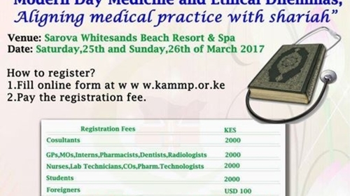 Kenya Association of Muslim Medical Professionals (KAMMP) invites you to its first International health Conference to be held at Sarova Whitesands hotel, Mombasa, in March 25-26, 2017, (Saturday and Sunday) under the theme