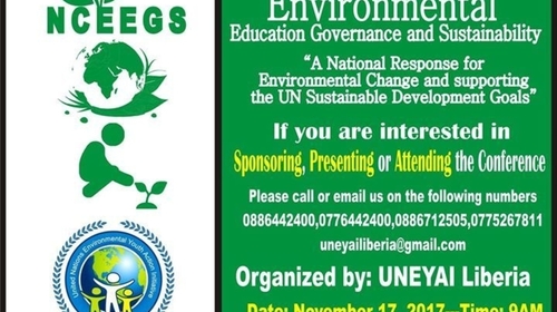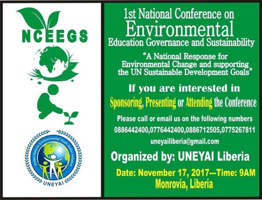 This will be the 1st National Conference on Environmental Education, Governance and Sustainability (NCEEGS) of its kind organized by the United Nations Environmental Youth Action Initiative (UNEYAI Liberia). UNEYAI Liberia believes that this conference will draw the attention of leaders in the public, private and non-profit sectors and delegates to strive for a better environmental education in our schools, communities, small and big groups, governing and sustaining our environment through collective initiatives.