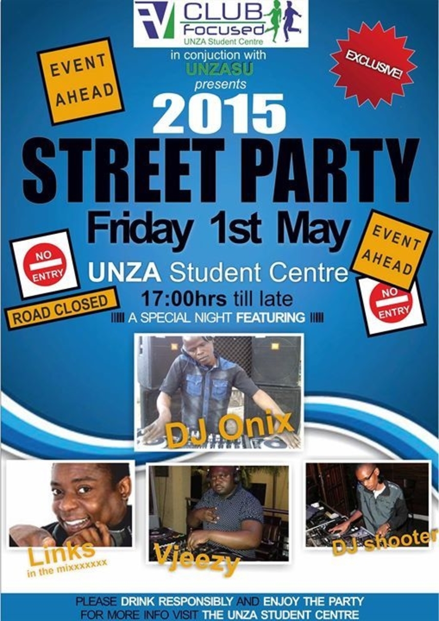CLUB FOCUSSED inconjuction with UNZASU presents 2015 STREET PARTY on 1st May, 2015. Charges: FREE FREE FREE Guest DJs: DJ Shooter, Links in the Mix, Vjeezy, and DJ Onix SEE YOU THERE!!!!!!!!!!!!!!!!!!!!!!!!!!!!!!!!!!