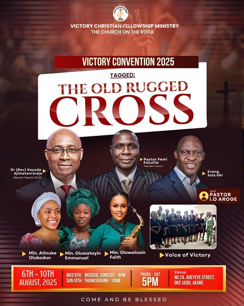 Join us for the inspiring 2025 Victory Convention β a gathering designed to uplift, motivate, and empower attendees through faith and community. Experience powerful sermons, worship sessions, and impactful teachings centered around the theme "The Old Rugged Cross". This event promises a transformative spiritual experience, fostering connection and renewal among believers. Don't miss out on this spiritual celebration that unites hearts and minds in a shared journey of faith. ππβ¨