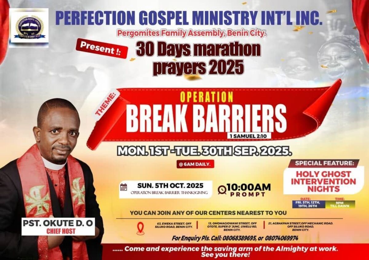 Join us for the 30 Days Marathon Prayer Congress, a spiritual marathon designed to ignite your faith and deepen your prayer life. This transformative event offers a unique opportunity to engage in continuous prayer, worship, and spiritual renewal over an entire month. Experience powerful sessions, community fellowship, and divine breakthroughs as you count down to operation break barriers 2025. πβ¨