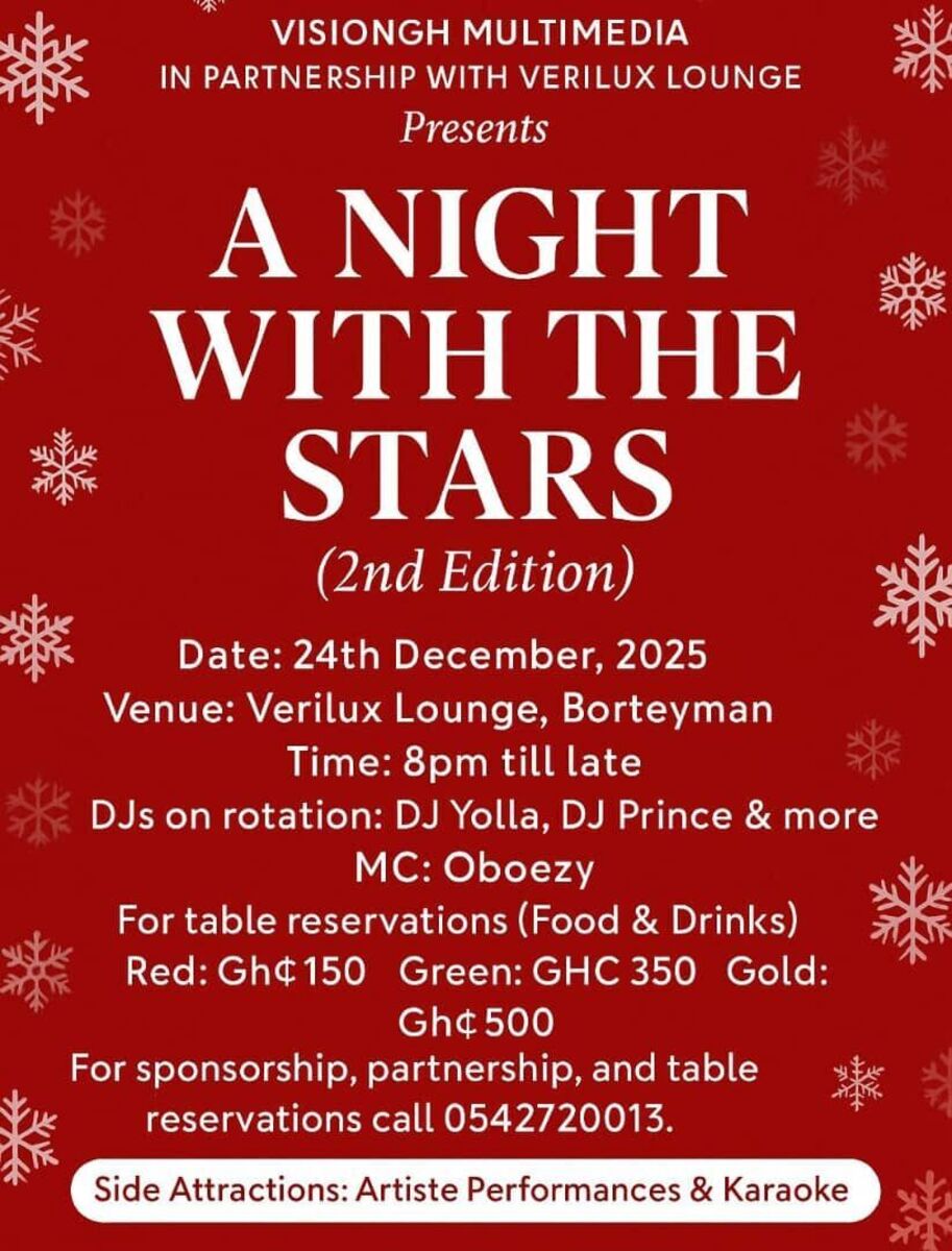 VisionGH Multimedia in partnership with Verilux Lounge brings to you the second edition of your favourite event A NIGHT WITH THE STARS on the 24th December, 2025 at the Verilux Lounge inside Borteyman. You don't want to miss out on this one. See you there