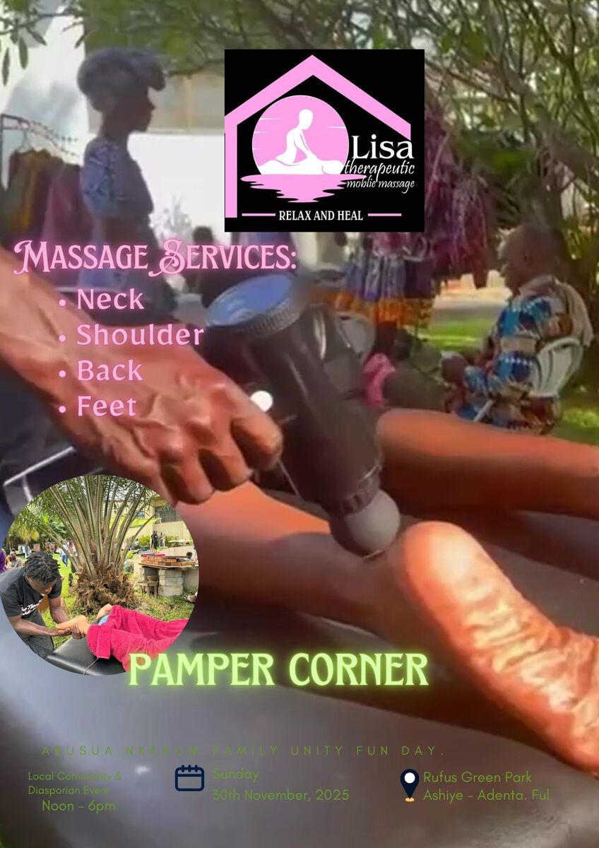 All Day Pamper Corner: Come prepared to Treat yourself, to any of the body care pamper experience. Neck, Shoulder, Back, Feet Massage.