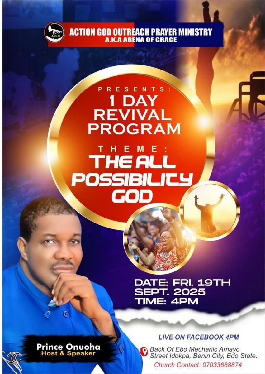 Join us for an inspiring and powerful One Day Revival Program hosted by Action God Outreach Prayer Ministry. This spiritual gathering is designed to ignite faith, bring believers together in prayer, and experience the limitless power of God.