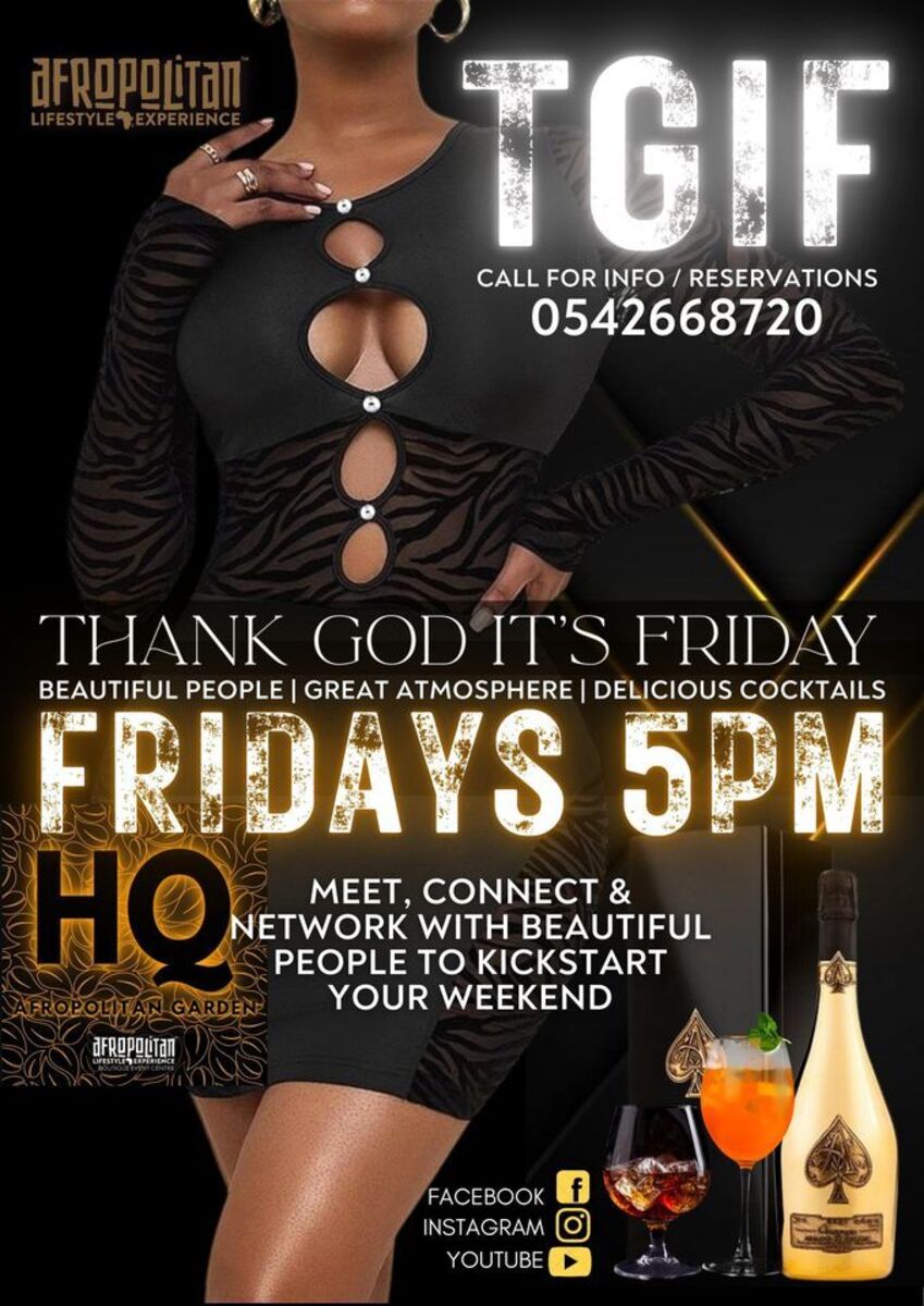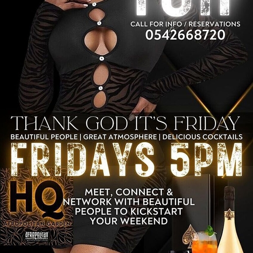 Fridays are always FUN but now they're going to become AMAZING! All the beautiful people of Accra North will be heading towards HQ Afropolitan Garden... Who knows whom you'll meet? Happy Hour starts at 5pm for the early bird... Hungry? You're covered! Thirsty? You'll be blown away! Soon you'll understand why HQ is being called Accra's Best Kept Secret! Call or DM 0550353972 for reservations and packages details