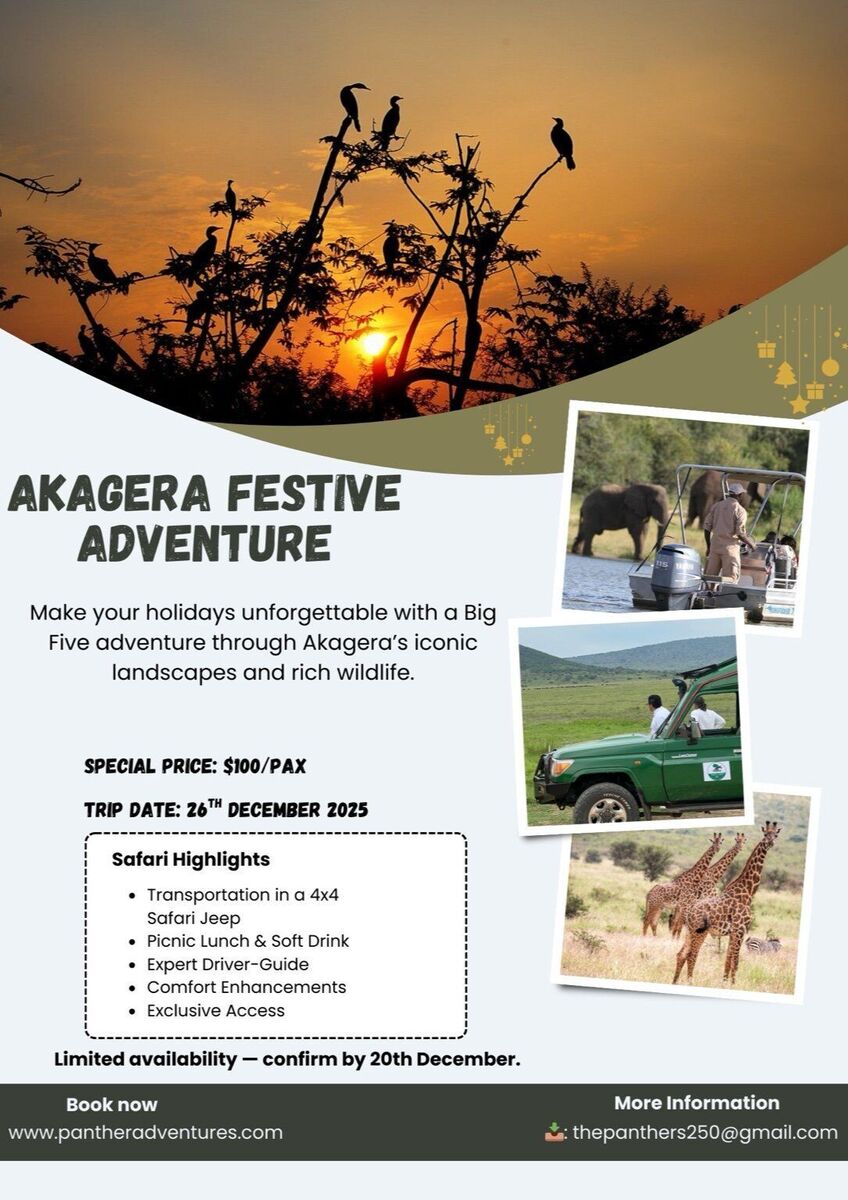 Embark on a magical holiday safari with the Akagera Festive Adventure! Dive into the heart of nature as you explore rolling savannahs, shimmering lakes, and dense woodlands. Spot the majestic Big Five, playful zebras, elegant giraffes, and gentle hippos in their natural habitat. This premium safari offers expert guidance and unparalleled comfort, creating a holiday experience that’s perfect for wildlife enthusiasts and adventure seekers alike. Make this festive season unforgettable with a celebration of nature and lifelong memories!