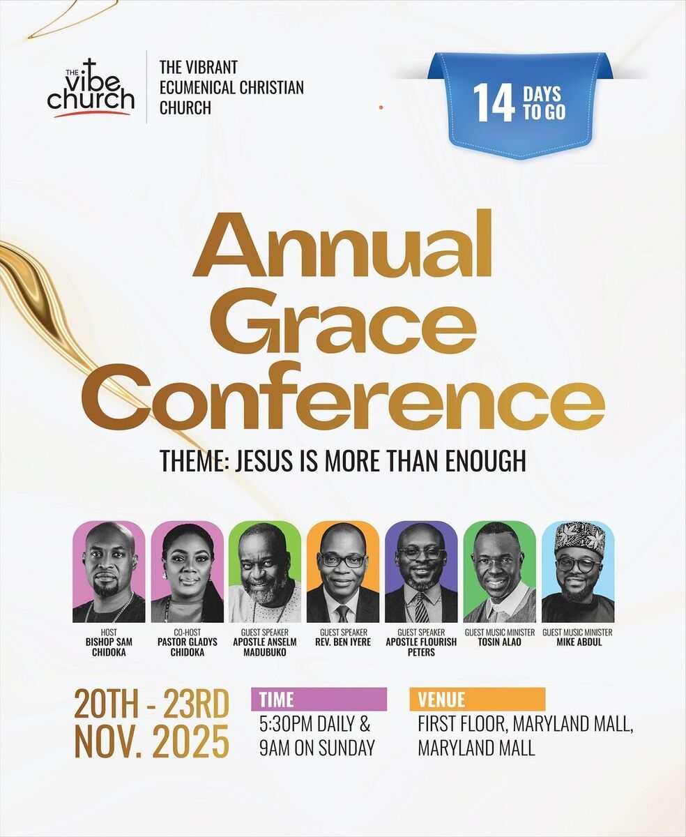 π Get ready for a powerful spiritual gathering at the Annual Grace Conference 2025! Experience an atmosphere charged with divine presence, worship, and life-transforming messages. This event promises an unforgettable move of God where Jesus is revealed as More Than Enough! Expect anointed speakers, healing, and divine encounters that will uplift your faith. Invite friends and family to join this visitation β a time of renewal, revival, and divine breakthroughs! πβ¨