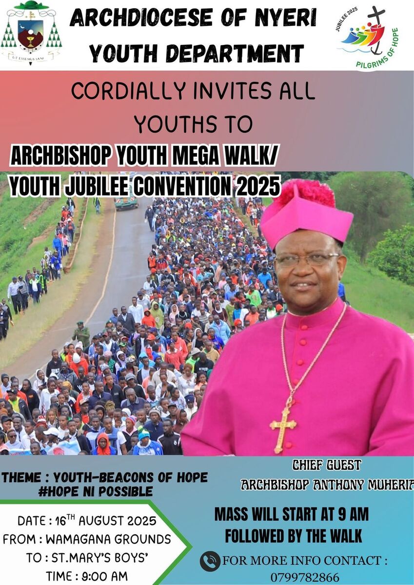 Join us for an inspiring day of faith, unity, and celebration at the ARCHBISHOP YOUTH MEGA WALK & YOUTH JUBILEE CONVENTION 2025! This vibrant event invites all youths to come together in a journey of hope and community spirit. Starting with a Mass at Wamagana Grounds, the walk immediately follows, symbolizing unity and purpose. Embrace the theme: Youth โ Beacons of Hope, as we celebrate the spirit of youth during this Jubilee year. With Archbishop Anthony Muheria as the chief guest, it's a perfect opportunity to connect, reflect, and be inspired. Don't miss this chance to be part of something truly uplifting! ๐ถโโ๏ธ๐ถโโ๏ธโจ