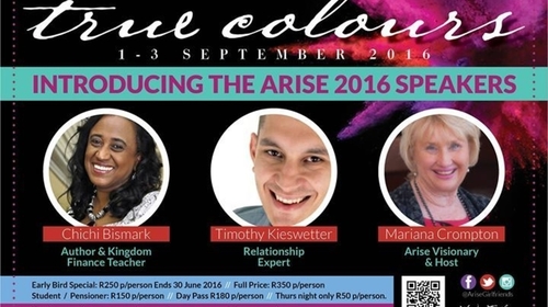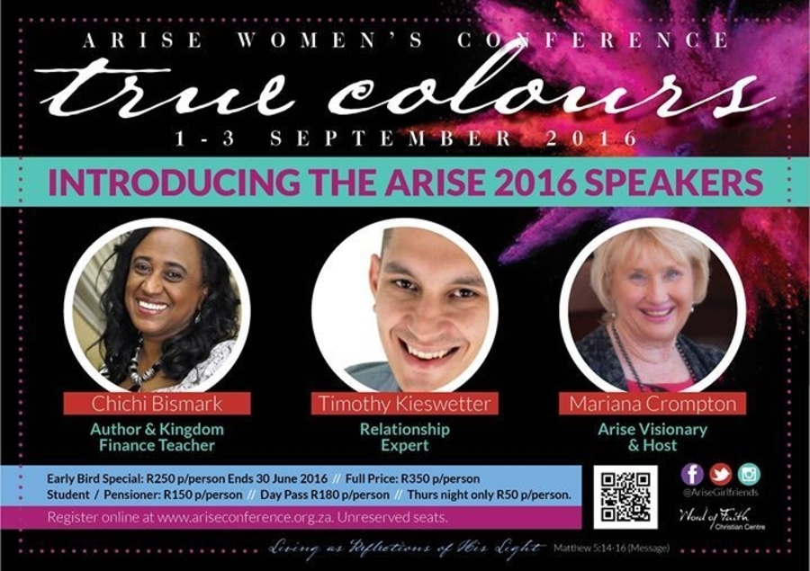 This year the Arise Women's Conference presents True Colours, with author and kingdom finance teacher, ChiChi Bismark, relationship expert, Timothy Kieswetter and Arise visionary and host, Mariana Crompton.