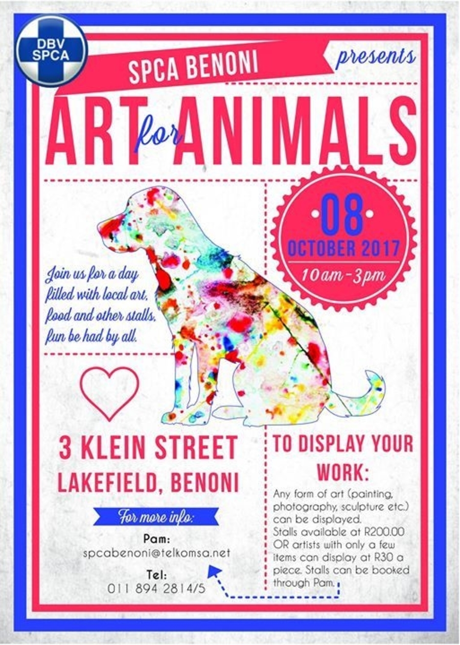 BENONI SPCA ART FOR ANIMALS. Please do come & join us for the day and enjoy a pleasant day. There will be refreshments. Anyone who may like to display their arts are most welcome.