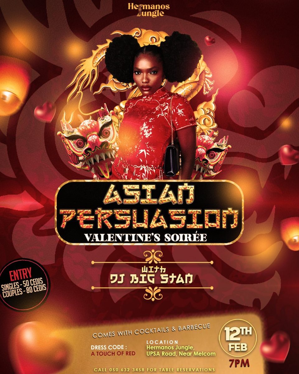 Chinese Cupid is flying to the Jungle this Saturday, 12th February to kick off the Valentine's celebrations! 🇨🇳Asian Persuasion Valentine's Soirée🧧 Date: Saturday, 12th February, 2022. Time: 7PM. Location: Hermans Jungle. UPSA road, next to Melcom Rate: 50 cedis for singles, 80 cedis for couples. Enter before 9PM and get a free cocktail. 情人节快乐! #valentines#soiree#ghana#accra#nightlife#afrobeats #amapiano#romantic#nightlifeinaccra#accraghana
