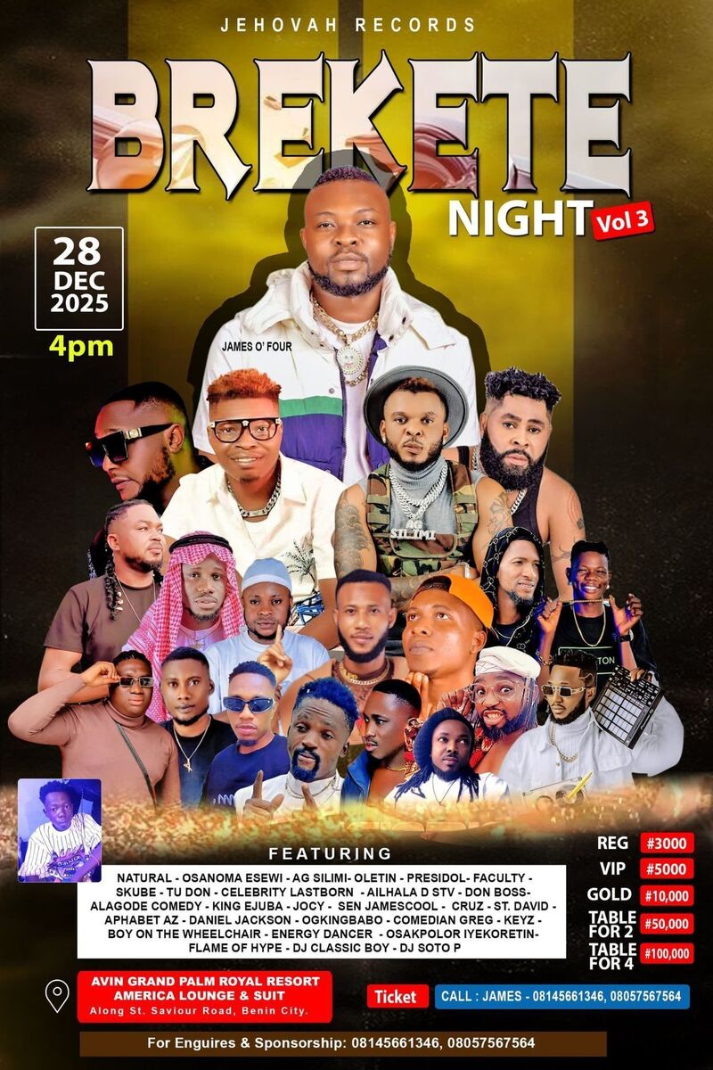 Join us for Avin Grand, an exciting event happening in the vibrant city of Benin City! Experience an evening filled with entertainment, community spirit, and unforgettable moments. This event is perfect for those looking to enjoy local culture, connect with friends, and support a fantastic show. Whether you're a music lover, a supporter of local talents, or simply looking for a lively night out, Avin Grand promises an engaging experience. Don't miss out on this special occasion — be part of the celebration and make memories that last! 🚀🎉