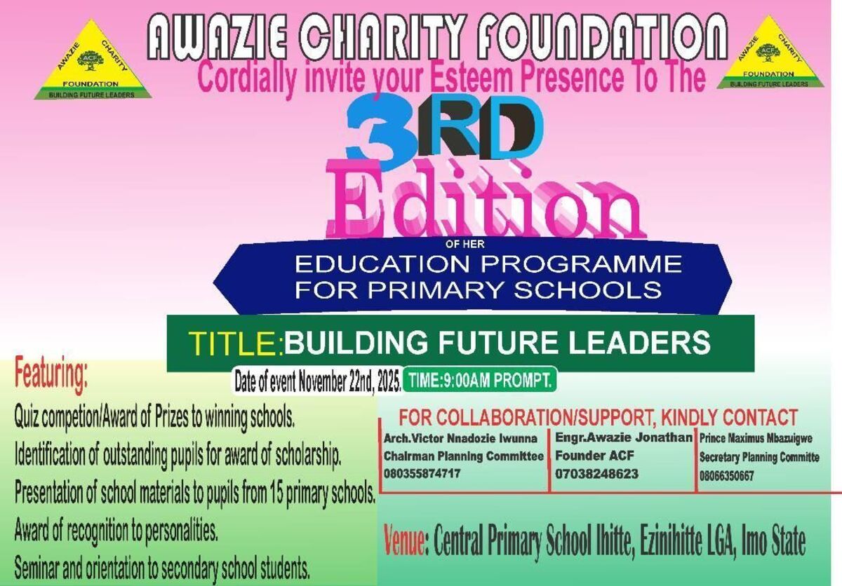 π Join us for the Awazie Charity Foundation Annual Quiz Competition, an inspiring event dedicated to nurturing future leaders through an engaging quiz. This year's event has been postponed to November 22, 2025, offering more time for preparation and excitement! πβ¨