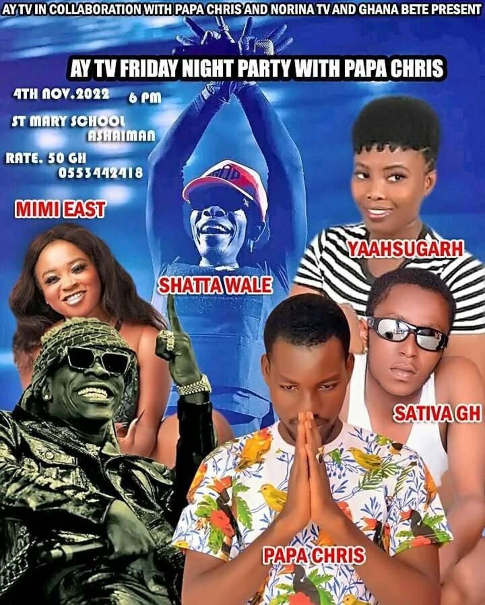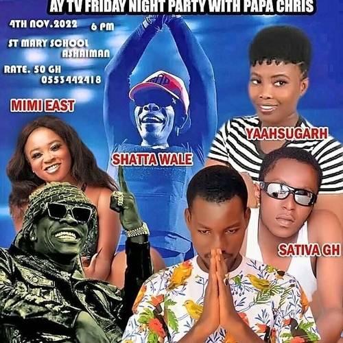AY TV Friday Night Party with Papa Chris is a Party hosted with AY TV and Papa Chris with all celebrities to celebrate and have fun and one on one interactions with the celebrities. Rate: 50 Gh single
