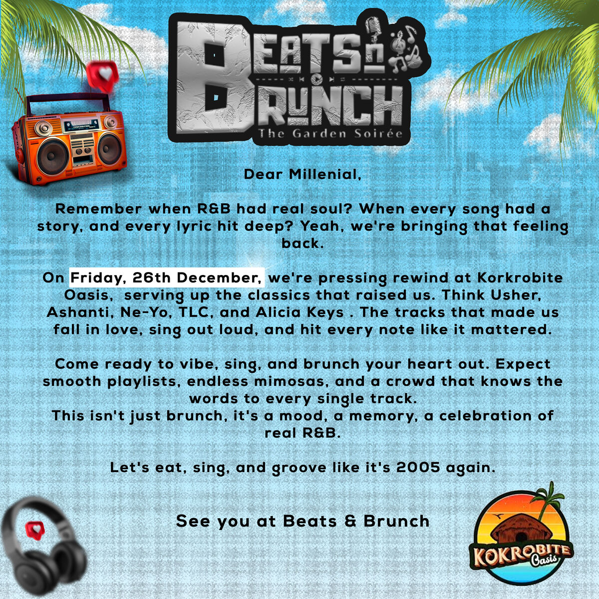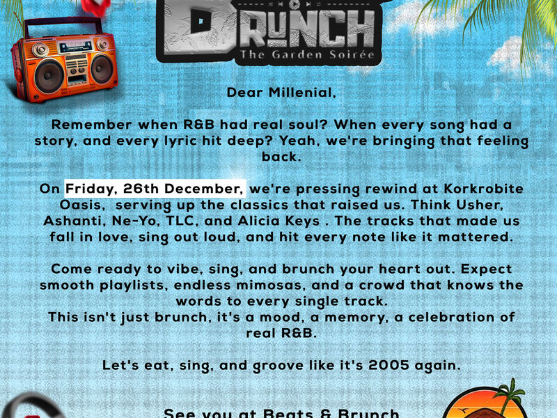 Step into the ultimate throwback experience where good food meets great music. Beats & Brunch is more than just a brunch — it’s a celebration of timeless R&B, soulful vibes, and unforgettable moments.
