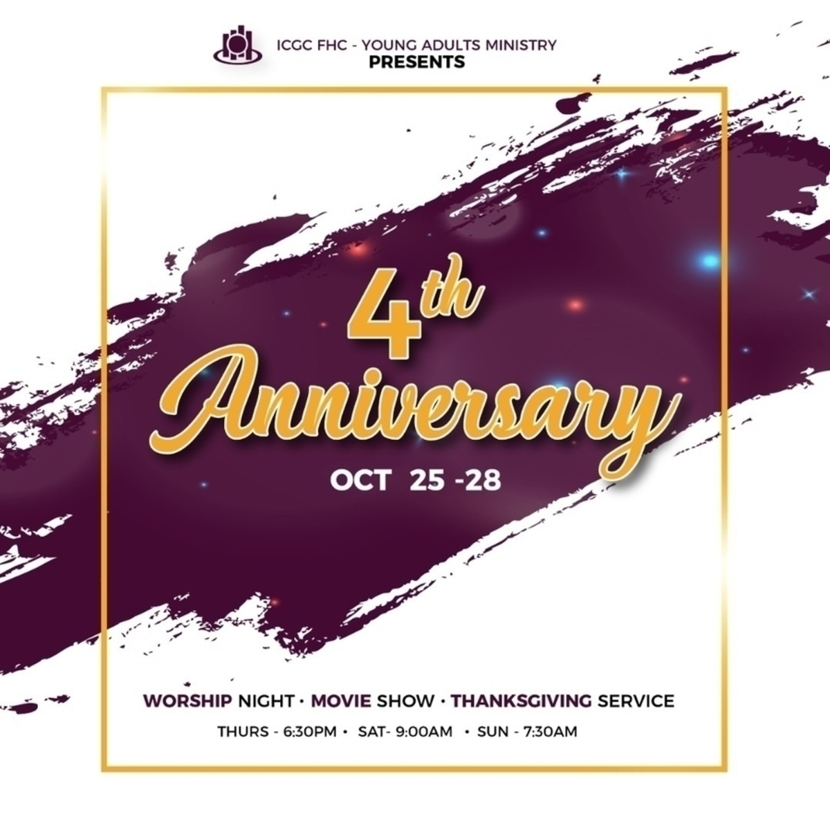 The young adult ministry of ICGC Father's House Chapel celebrates our fourth anniversary from October 25th to 28th. Come let's worship, give thanks and make memories.
