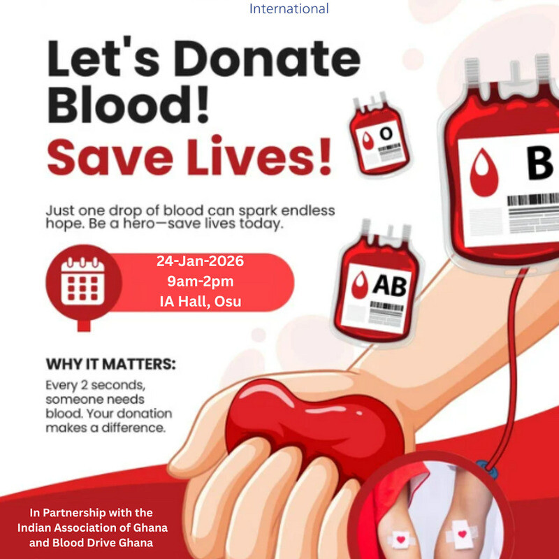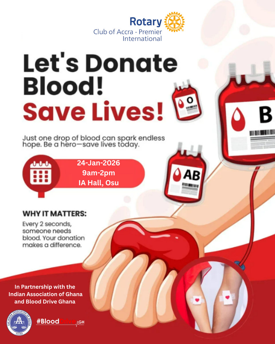Join us on Jan 24, 2026, from 9:00 AM to 2:00 PM, as the Rotary Club of Accra-Premier International partners with Blood Drive Ghana and the Indian Association of Ghana for a Mass Blood Donation at the Osu Temple Main Hall (IA Hall).
