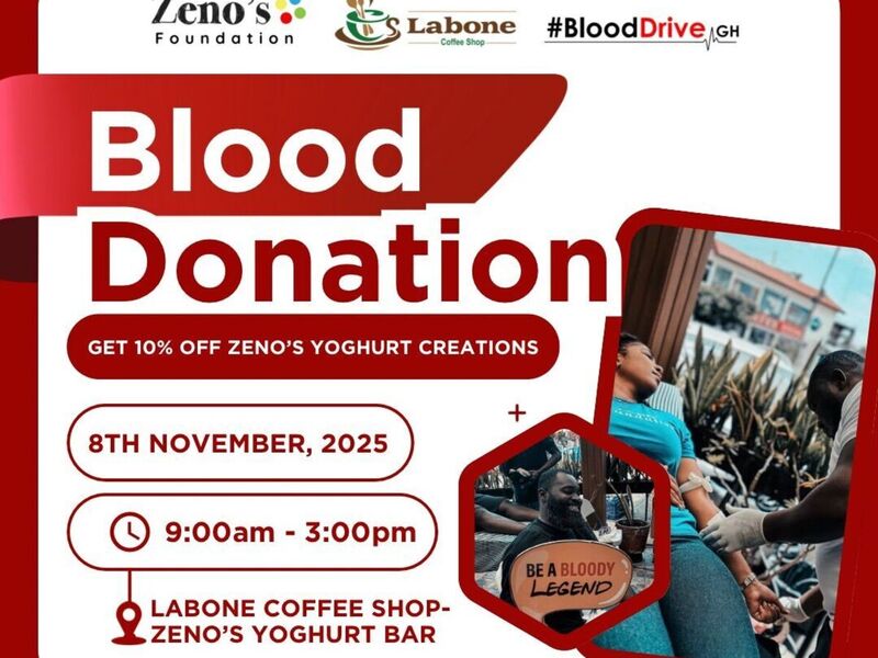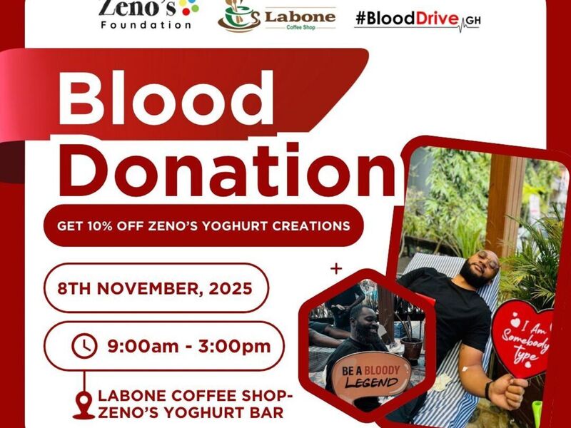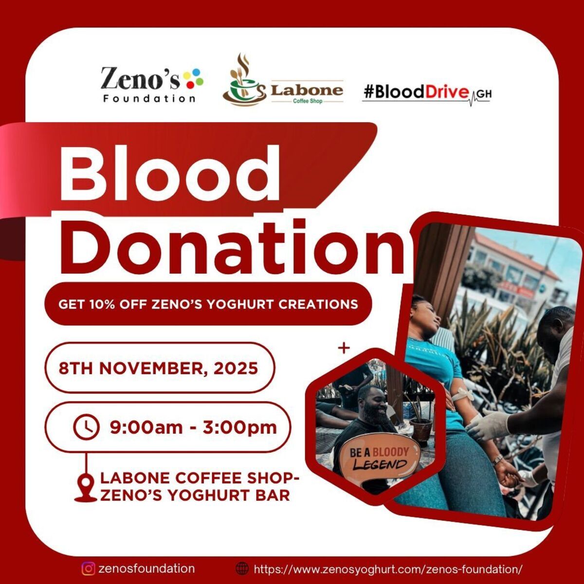 Blood Drive Ghana in collaboration with The Zeno's Foundation and The Labone Coffee Shop is organizing a Blood Donation Drive at Labone Coffee Shop-Zeno's Yoghurt Bar in Labone on Saturday 8th Nov 2025.