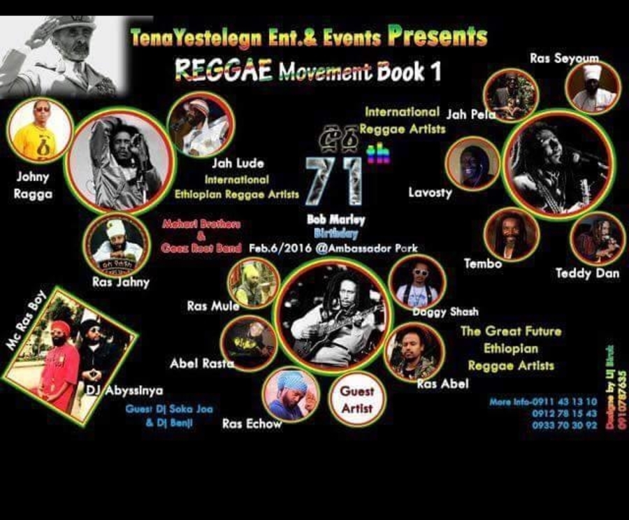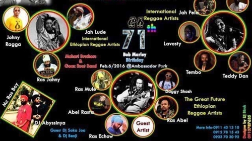 a big reggae concert tribute to 71st years anniversary of Bob Robert Nista Marley presented by Tenaystelen entertainments&events.in the concert almost 90% of all Ethiopian raggae artists and some gust artist from jamica,kenya and england will perform.adress Ambassador park .