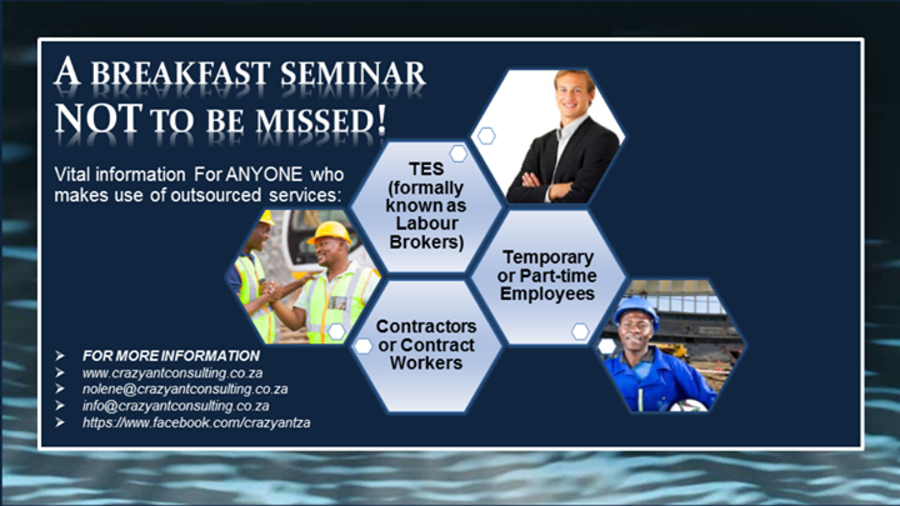 Crazy Ant Consulting is proud to present the first of a series of seminars we will be hosting this year. This seminar is a MUST if you currently use or plan on using a Temporary Employment Service Provider (formally known as a Labour Broker) or even Temporary Employees. For more information visit our Facebook page and "Like" us to be kept up to date with all our upcoming seminars www.facebook.com/crazyantza