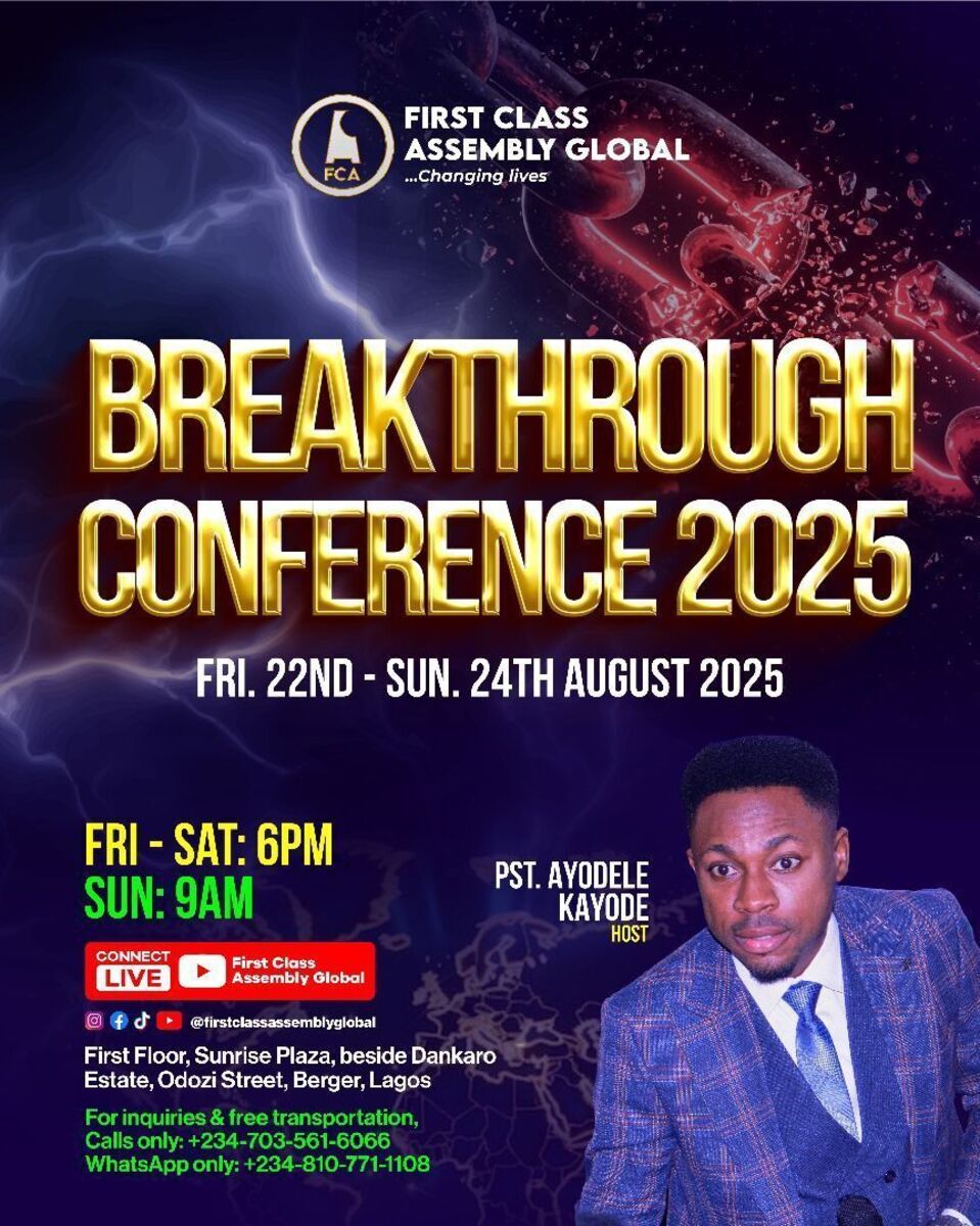 ๐ Breakthrough Conference 2025 is set to be a transformative spiritual gathering where faith, prayer, and divine encounters come together. This event offers a unique opportunity to experience lasting breakthroughs that can impact your life and generations to come. Join us as we seek God's face, pray for breakthroughs, and experience powerful moments of spiritual renewal. Whether you're looking for personal growth, divine intervention, or a community of believers, this conference promises an inspiring atmosphere filled with faith, worship, and prayer. Don't miss this life-changing event! โจ๐