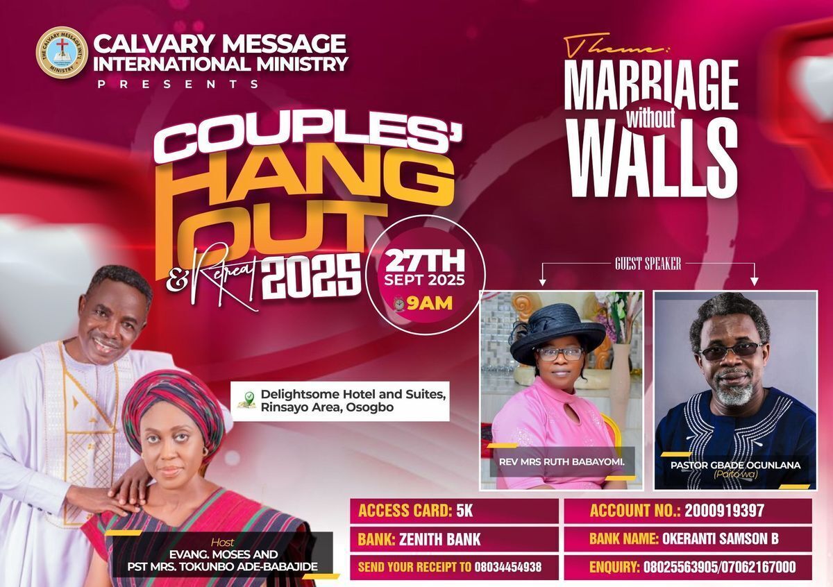 Join us for a transformative spiritual gathering at CALVARY MESSAGE INTERNATIONAL MINISTRY, where love, renewal, and divine impartation take center stage. This event is specially designed to strengthen marriages, deepen bonds, and foster divine connections among couples. Experience a time of heartfelt bonding, spiritual upliftment, and life-changing encounters. 💖
