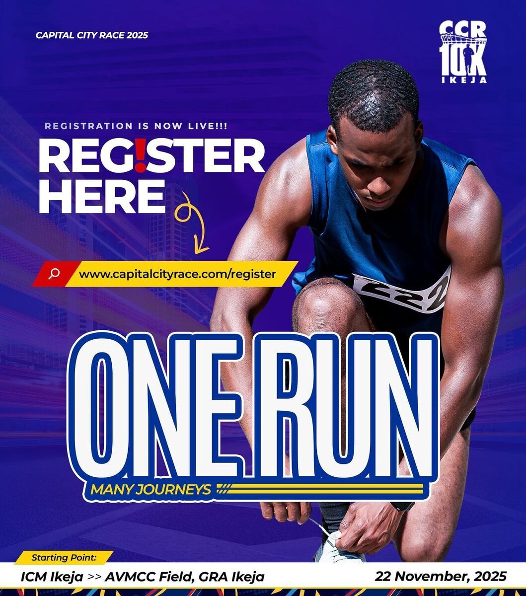 Get ready for the Capital City Race 2025! ๐โโ๏ธ๐จ This exciting event invites runners to experience Lagos like never before, connecting communities through a spirited race from ICM Ikeja to AVMCC Field, GRA Ikeja. Feel the adrenaline, enjoy the vibrant atmosphere, and be part of a memorable sporting celebration that promotes health, unity, and fun. Whether you're a seasoned athlete or a first-time participant, this race promises an energizing experience filled with camaraderie and achievement. Donโt miss out on this opportunity to challenge yourself and enjoy Lagosโ beautiful scenery! ๐ฝโจ