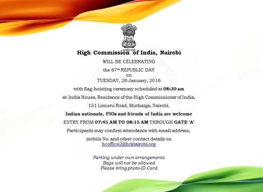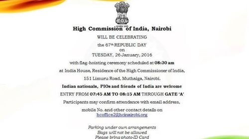 High Commission of India, Nairobi will be celebrating the 67th Republic Day on Tuesday, 26th January, 2016 with flag-hoisting ceremony scheduled at 08:30 am at India House, Residence of the High Commissioner of India,151 Limuru Road, Muthaiga, Nairobi. Indian nationals, PIOs and friends of India are welcome.
