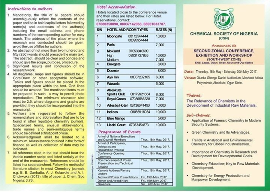 The second zonal conference of the Chemical Society of Nigeria to be hosted by the South-West Zone of the society is scheduled to hold as stated. The conference is opened to Chemists and Chemistry practitioners. "What in the world is not Chemistry"