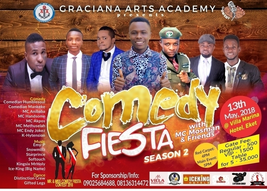 COMEDY FIESTA is a yearly event which started on 2017 and now is here again this year; 2018 coming up on 13th May, 2018 at Villa Marina Hotel, Eket L.G.A, Akwa Ibom State, Nigeria being the “SEASON 2” with a unique platform for the exhibition of good talents in comedy, music, dance and much more by the youths. This event is aimed at providing a comic relief and motivation to people of all works of life, bringing everyone together in love and as well creating a platform for talent exhibition/exploration. The dream and vision of this event “COMEDY FIESTA” was brought to manifestation on 14th May, 2017 by one of Eket’s most talented and funniest Comedian “MC MOSMAN”.