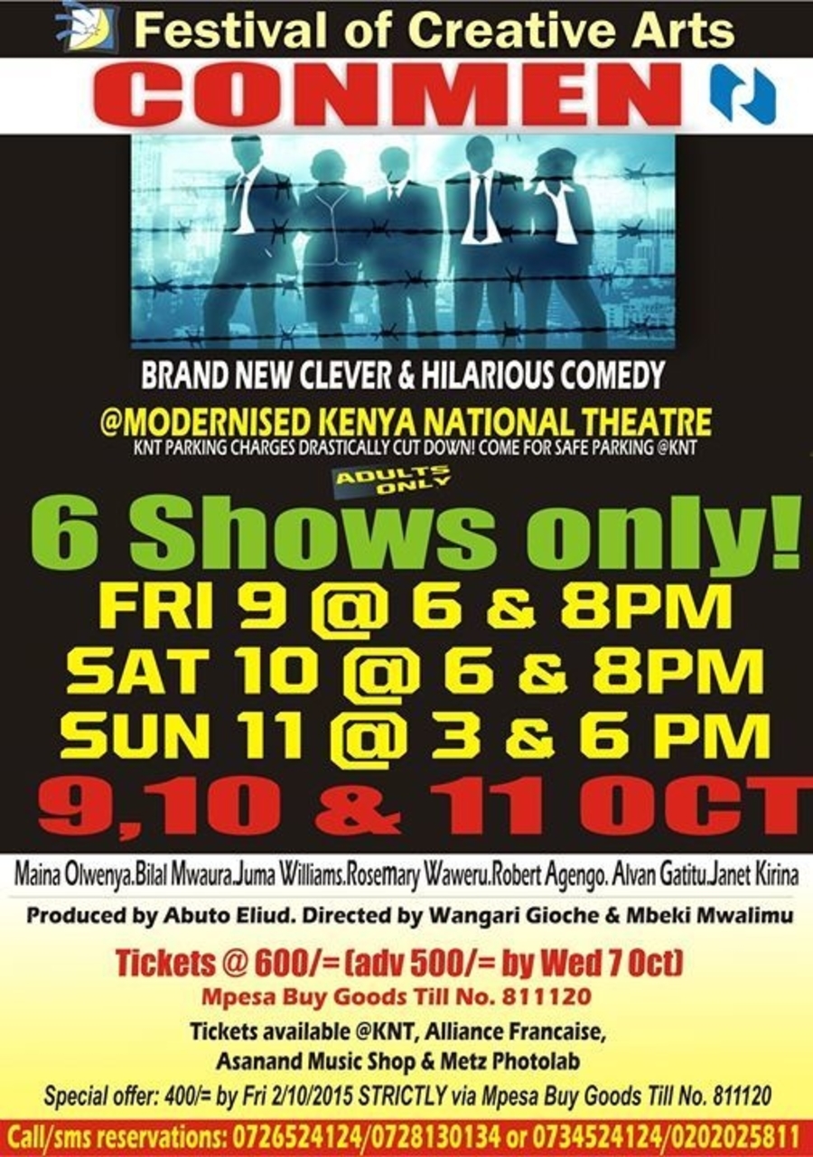 Maina Olwenya plays the great con man...Mwaura N Bilal plays his sidekick. Lined up for conning are a bank manager played by Juma 'Anderson' Williams, Jewellery expert played by TPF finalist Alvan Gatitu, his sister performed by Janet Kirina, His sister's husband played by Robert Agengo, his sister's friend (who's heart he must steal as well) played by Rosemary Waweru. 9-11 October at Kenya National Theatre. This is one show you miss and you regret for life! Tickets at 600/= (Advance at 500 bob by Wednesday 7th Oct.) Call 0726524124/0728130134/0734524124/0202025811. Mpesa Buy Goods Till No. 811120. Special offer at only 400 bob strictly via Mpesa by Friday 2/10/2015. Get your ticket today