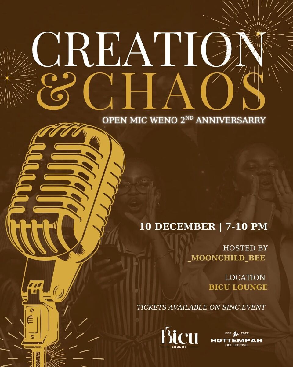 Celebrate the 2nd anniversary of Open Mic Weno with an unforgettable night of creativity and storytelling at Creation & Chaos! For the first time ever, this event embraces a powerful theme—inviting you to explore the mess behind your art, the entanglement within your creativity, and everything in between that defines you as a creative or storyteller.