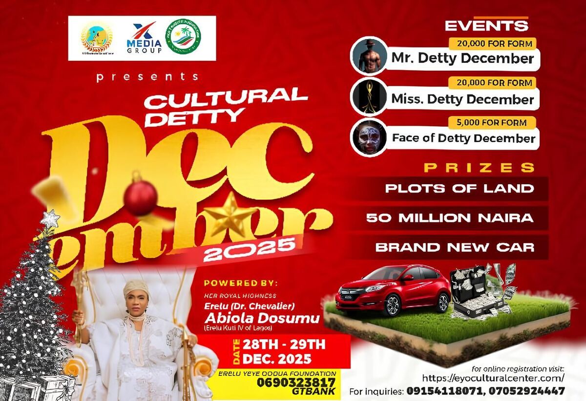 Step into one of the biggest cultural showcases of the year at Cultural Detty December 2025. Hosted by Her Royal Highness Erelu (Dr. Chevalier) Abiola Dosunmu, Erelu Kuti IV of Lagos, this event promises an unforgettable celebration of African heritage and style. Immerse yourself in a vibrant night of culture with the Mr. Detty December, Miss Detty December, and Face of Detty December pageants, featuring live cultural performances, stunning showcases, and the presentation of major prizes including plots of land, ₦50 million cash, and a brand new car. Be part of an extraordinary experience that celebrates beauty, excellence, and tradition.