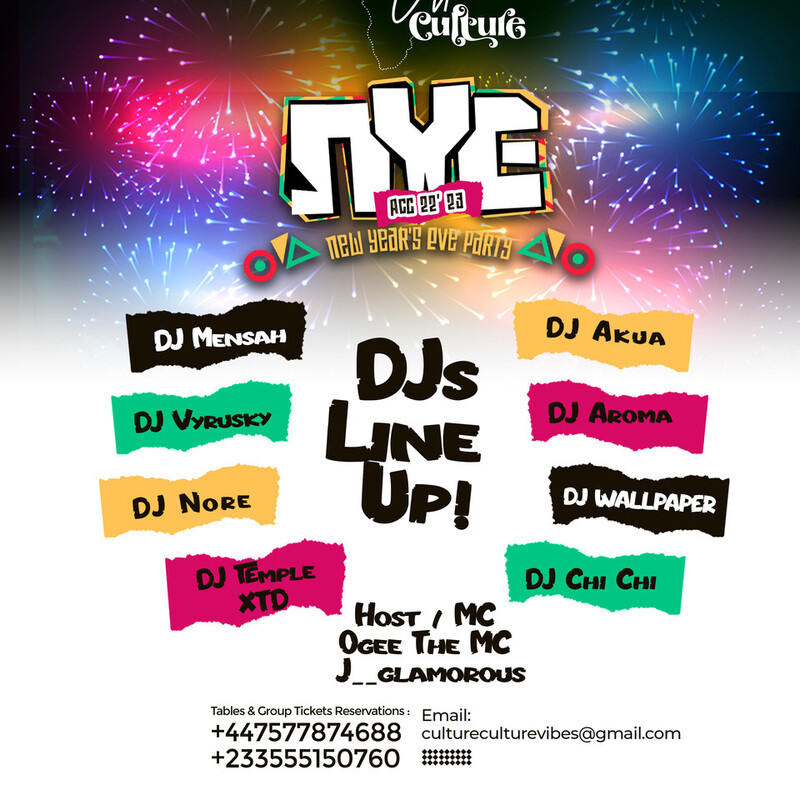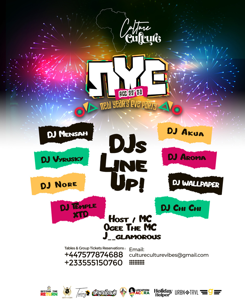 Culture Culture NYE Party - ACC 22’ 23’ is the biggest NYE event that seeks to provide VIP nightlife experience & fireworks. It is designed to showcase amazing experiences from the best of the best event host around the world, hence creating a platform that seeks to remind us of diversity and inclusion at the same time celebrating creative arts & culture in a unique and exciting way through music, food, dance and great Afrobeats and Amapiano performances by creative artistes. This event is powered by Location Accra, Guvnor Levi, Akwaaba UK, Twinsdontbeg, Holiday Helper, Urbn Trvl and Legendary Consult.