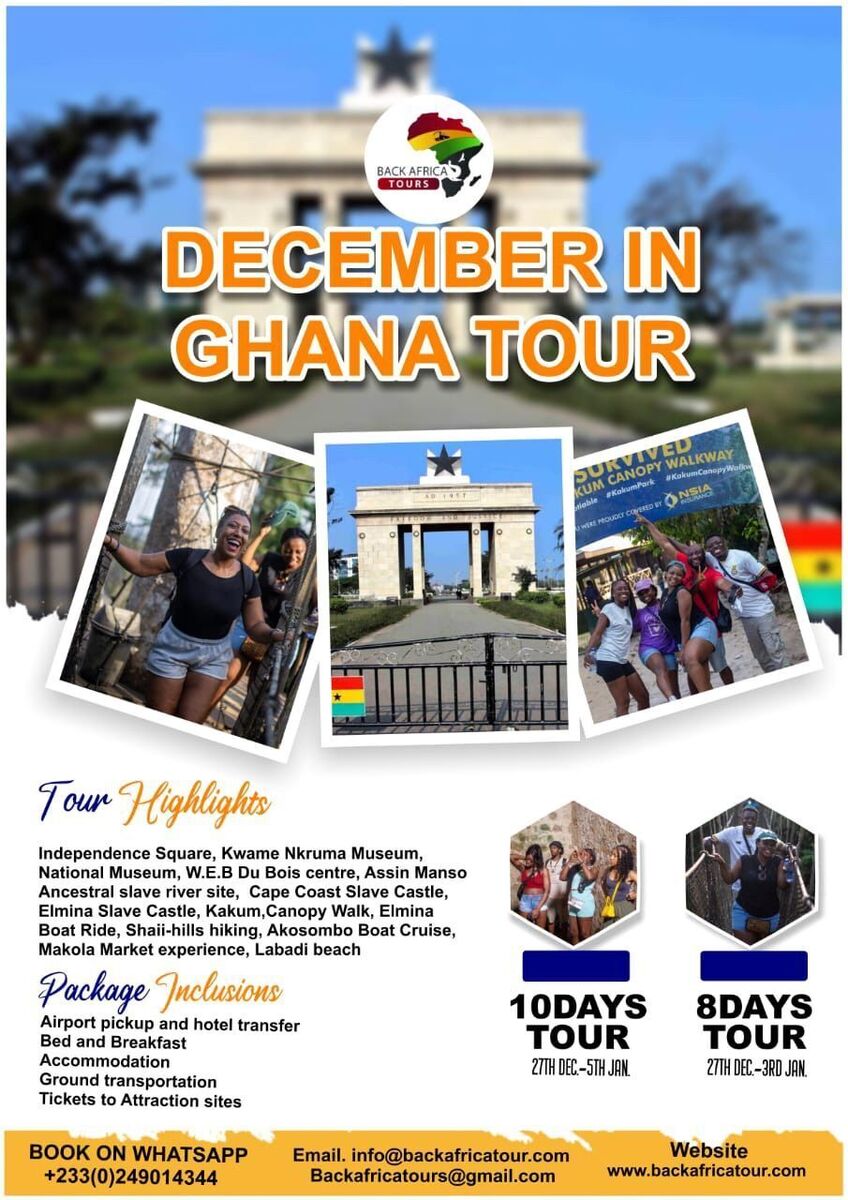 Experience the magic of Ghana this December! 🎉 Join us for a festive and unforgettable journey through vibrant culture, rich history, and stunning natural beauty. From lively festivals like Afrochella to exploring historic sites such as Cape Coast Castle and Elmina Castle, this event offers a perfect blend of celebration and cultural immersion. Enjoy traditional drumming, dance performances, relaxing beaches, and adventurous hikes in Kakum National Park and Shai Hills. Cruise along the Akosombo River or attend the annual Ghana Festival showcasing music, dance, and art. Whether you're a culture enthusiast, adventure seeker, or holiday traveler, this event promises an exciting Ghanaian experience to remember! 🌍✨