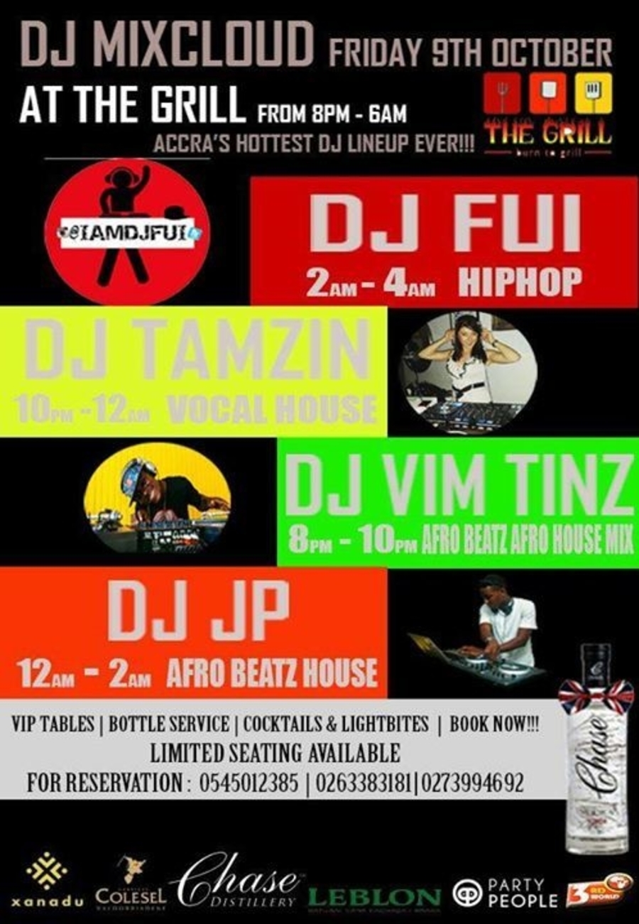 A night with the hottest DJ's in the city of Accra! Hot grills, drinks and endless music with DJ Fui, DJ JP, DJ Tamzin and DJ VimTinz