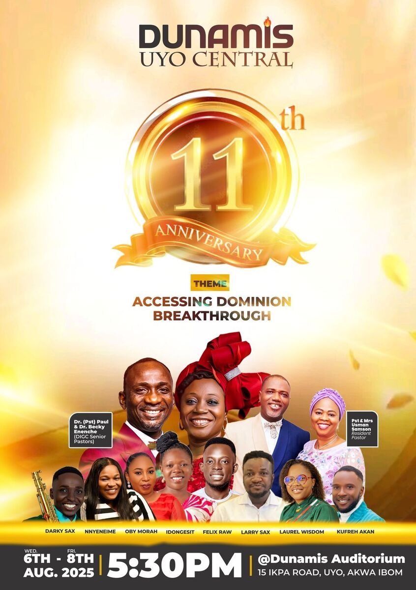 π Celebrate 11 glorious years of spiritual breakthrough and divine access with Dunamis International Gospel Centre Uyo Central! This special anniversary is a vibrant gathering of faith, praise, and prophetic declarations. Experience powerful teachings, soul-stirring worship, and community fellowship that ignites your spiritual journey. Join us for an empowering event designed to elevate your destiny and access your God-given dominion. Don't miss this extraordinary celebration where miracles happen and lives are transformed. πβ¨
