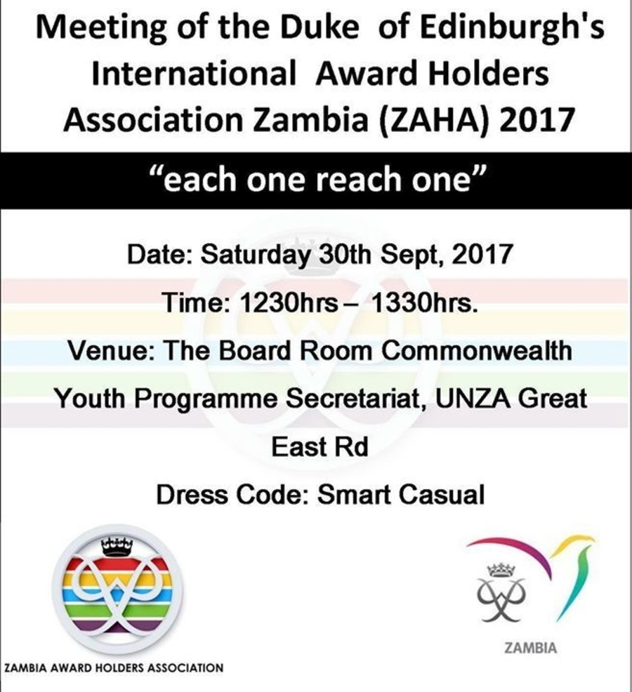The Duke of Edinburgh International Award for Young People - Zambia Invites all participants and Award holders (past and present) to an Award Holders Association meeting. Join us as we help grow the Award in Zambia!