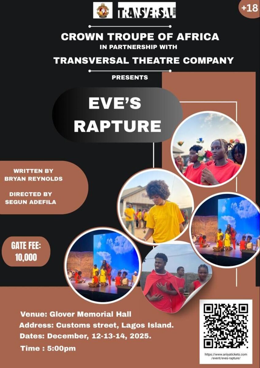 Experience the captivating theatrical production of Eve's Rapture, a compelling play written by Bryan Reynolds and masterfully directed by Segun Adefila. Presented by The Crown Troupe of Africa in collaboration with Transversal Theatre Company, this event promises an unforgettable journey into dramatic storytelling. Dive into a world of emotion, culture, and artistic brilliance with this must-see performance.