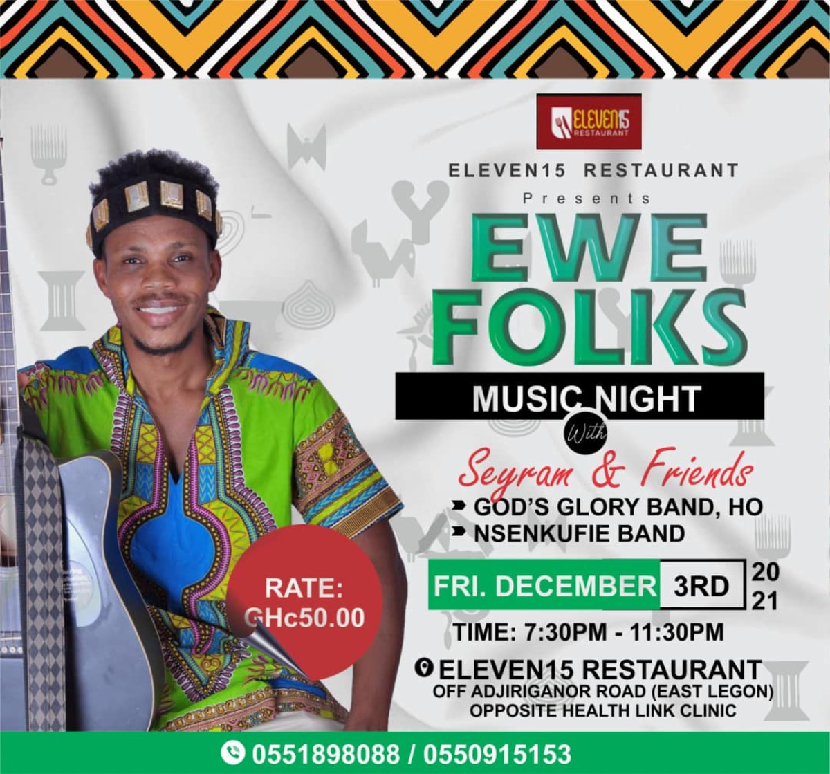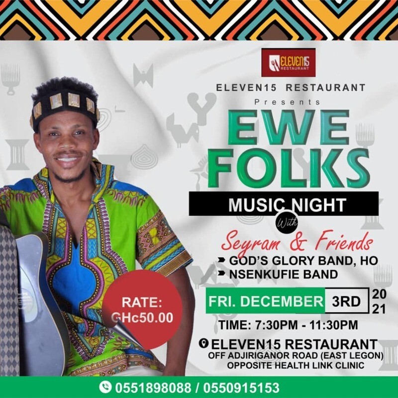 In his quest to Revive old and forgotten Ewe folk tunes in a contemporary style, The Ugandan-based Ewe Folk musician, Seyram Music brings you one night of beautiful Ewe Folk music night.