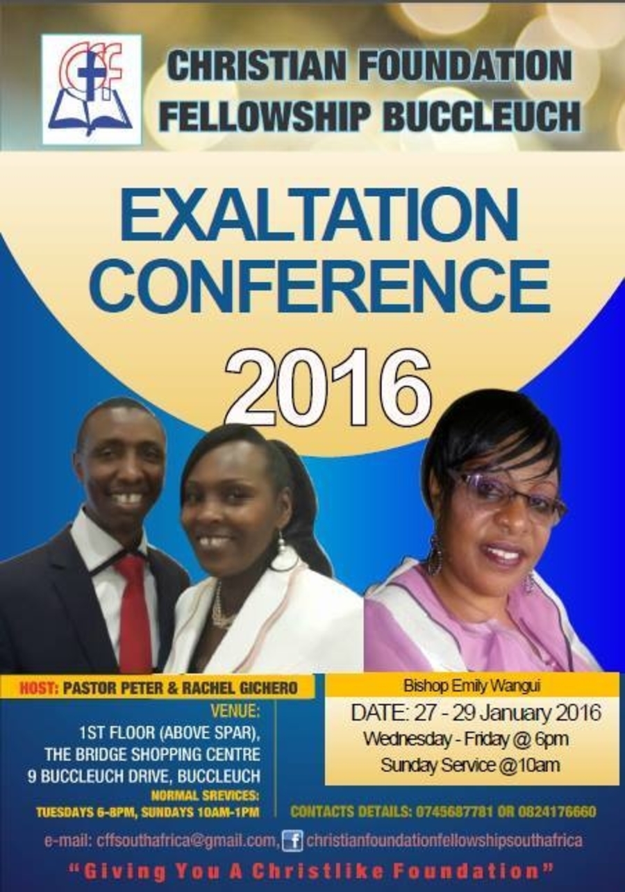 2016 EXALTATION CONFERENCE happening this Wednesday-Friday, 27-29 January at CFF Buccleuch from 6pm. Sunday Service at 10am. Bishop Emily Wangui is our GUEST MINISTER. You are all most welcome to worship with us.