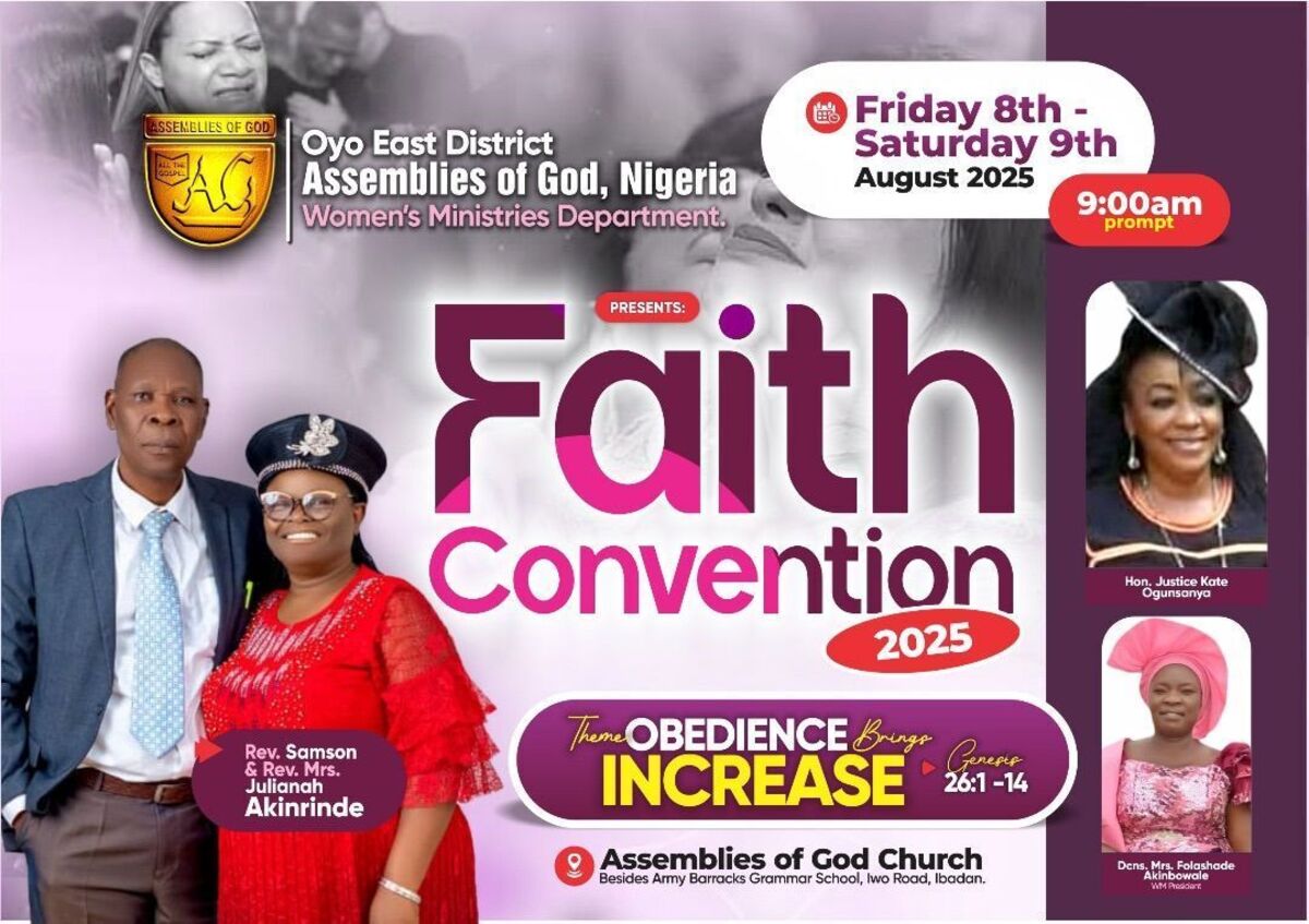 Join us for a powerful spiritual gathering designed to ignite your faith and deepen your walk with God! The Faith Convention 2025 is a two-day event filled with inspiring messages, impactful worship, and life-transforming encounters. Under the theme: Obedience Brings Increase, attendees will experience a divine atmosphere of breakthrough and spiritual renewal. Whether you're seeking spiritual growth, healing, or a fresh touch from the Lord, this convention promises to be a memorable and empowering experience. Don't miss this opportunity to connect with fellow believers and encounter the presence of God in a profound way! ✨🙏