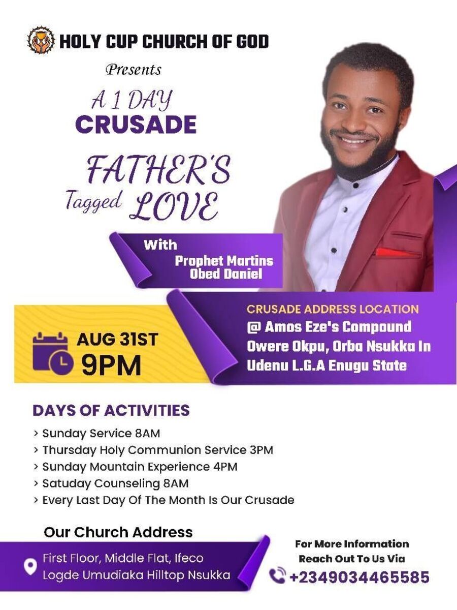 Join us for FATHER'S LOVE, a heartfelt crusade dedicated to celebrating and embracing the love of fatherhood. Experience an evening filled with inspiring messages, soulful worship, and powerful testimonies that uplift and encourage families. This event is a perfect opportunity to reconnect with faith, family, and community. Come and be part of a spiritual journey that promises blessings, love, and unity. β¨π