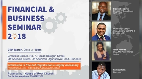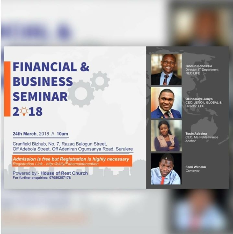 So if you are in Surulere and Environs and you would want to know the pros and cons of Entrepreneurship, Career Development and Financial Management with an avenue of meeting other great minds and expanding your ideas, then this is the event for you