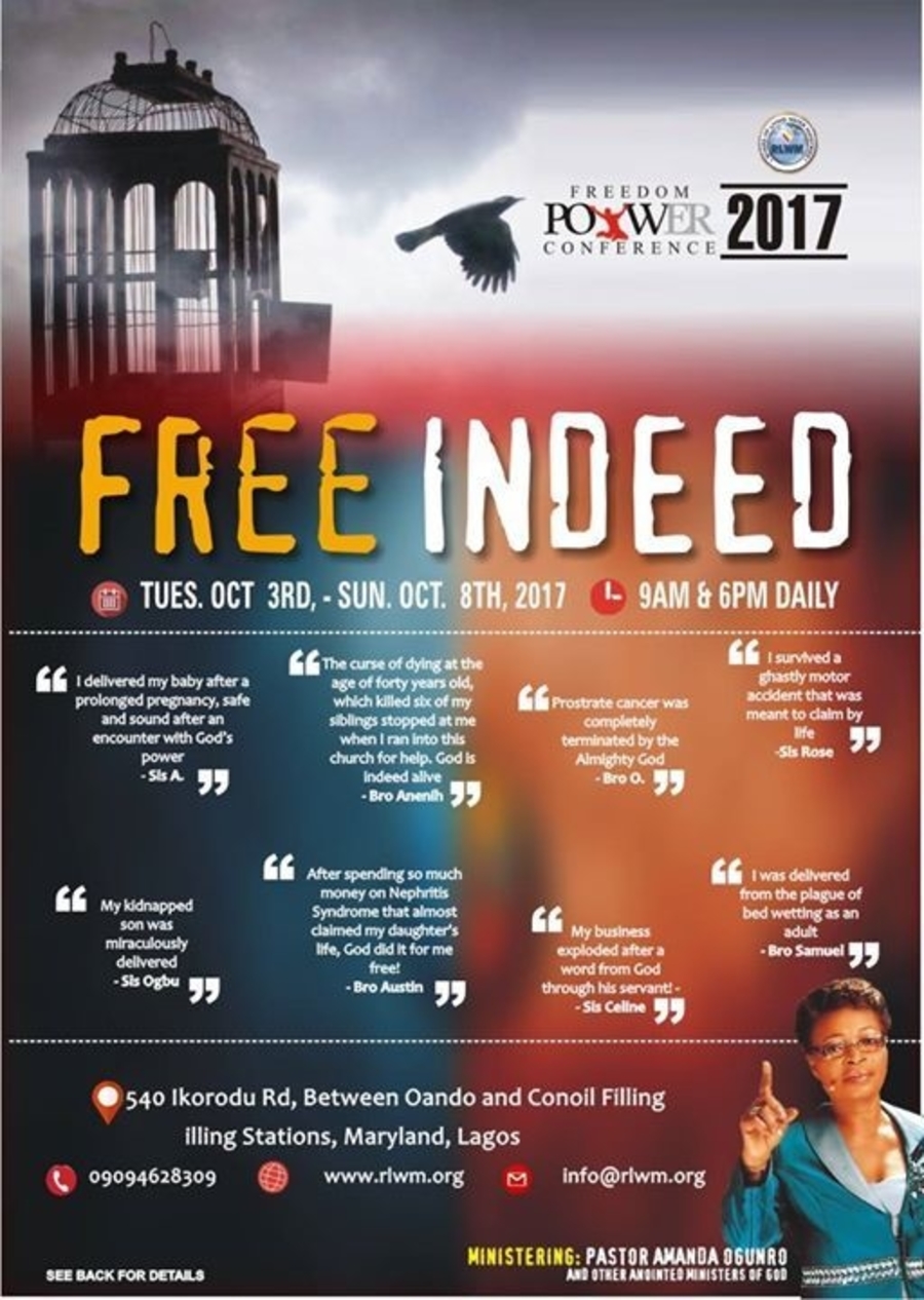 This year's edition is tagged FREE INDEED, with various specialized sessions and workshops for those believing God for child(ren), for healing from sicknesses and diseases, deliverance from curses and covenants, marital breakthrough, career/business breakthrough, and much more. You do not want to miss this amazing event as your testimony is sure.