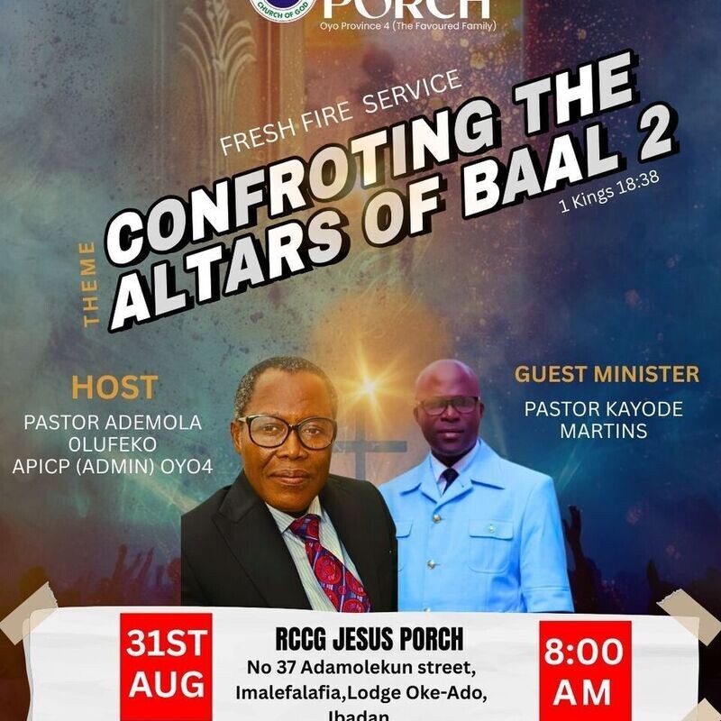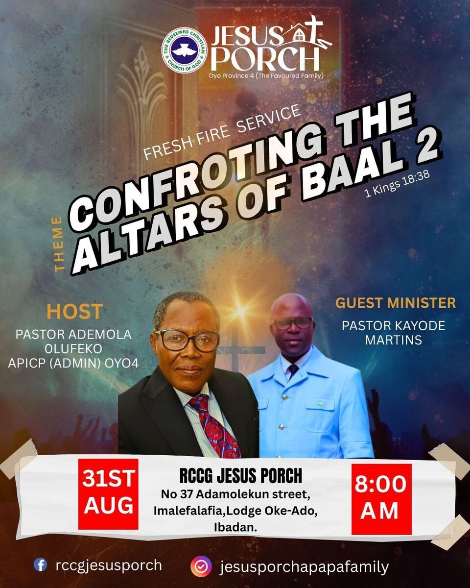 🔥 FRESH FIRE SERVICE is back! Prepare yourself for a divine encounter as we confront the "altars of Baal", reminiscent of Elijah’s powerful showdown in 1 Kings 18:38. Join us for a day of profound worship, spiritual breakthrough, and divine intervention. Led by our esteemed host, Pastor Ademola Olufeko (APICP Admin OYO4), alongside the anointed guest minister, Pastor Kayode Martins, this event promises an atmosphere charged with faith and miracles. Come with an open heart and be ready to experience a life-changing move of God.