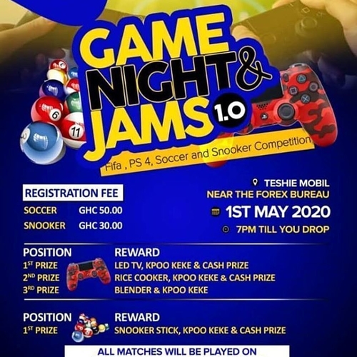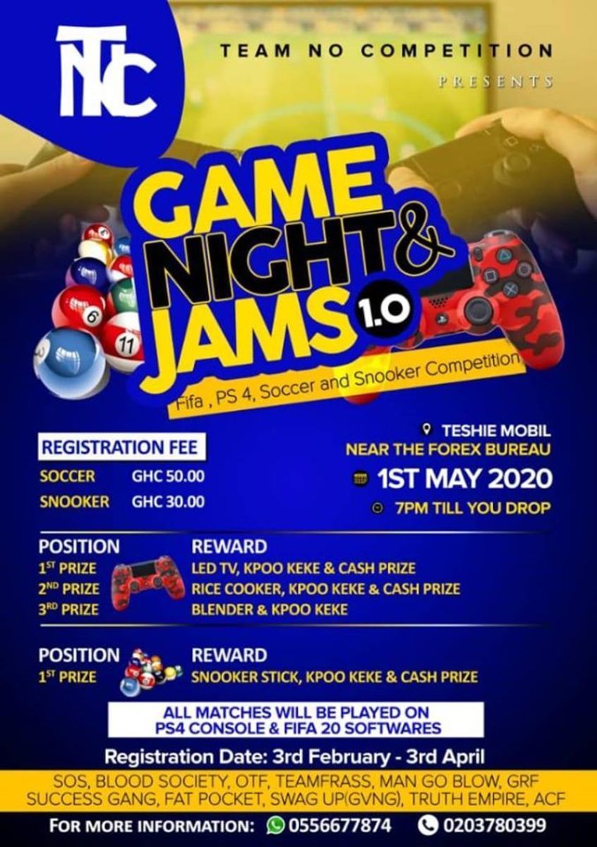 TeAM No COMpETITION presents to YOu Game Night Jams 1.0 Registration going on from now till 3RD April Make yourself available ๐ฅถ๐ฅถ๐ฅถ๐ฅถ๐ฅถPLs post and share on all media plataforms ๐๐๐you can hit me up on 0556677874 for more information Venue take place at teshie Mobil near THe forex bureau ๐ฅ๐ฅ๐ฅ๐ฅ๐ฅ๐ฅ๐ฅ