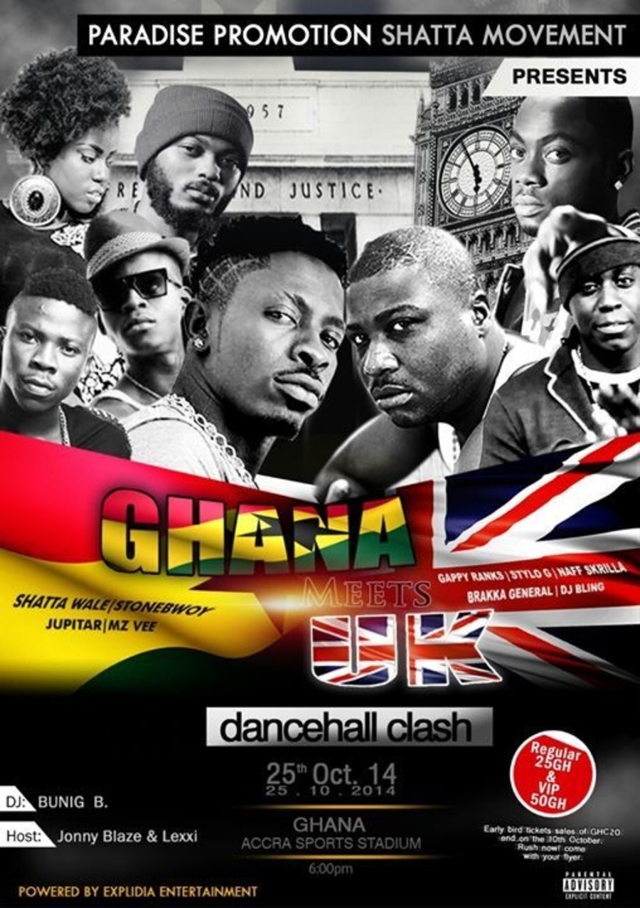 THE BIGGEST DANCEHALL CLASH EVER TO HIT THE SHORES OF GH. ITS ON TONIGHT LIVE ACCRA SPORTS STADIUM. GAPPR RANKS, SHATTA WALE, STYLO G, STONE BWOYS, JUPITAR, IWAN, MZVEE....MAAAAD TIN.